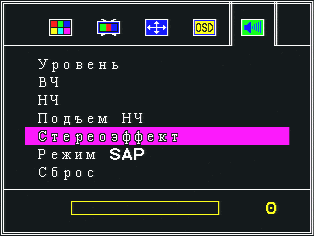 В разделе аудиопараметров можно найти настройки уровня громкости, тембра высоких и низких частот, включение/выключение режима Dynamic Bass Boost (Подъём НЧ в русскоязычном варианте), управление стереобазой и режимом SAP при наличии нескольких звуковых дорожек. Сюда же перекочевал и сброс настроек.