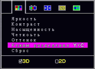 В отличие от продукции AVerMedia, предложения начать поиск каналов при запуске тюнера на экране не возникает. Первым разделом экранного меню является раздел видеонастроек. Кроме классических регулировок яркости, контраста, насыщенности и оттенка, здесь можно выбрать режим разделения яркостной и цветностной составляющих сигнала — 2D или 3D. Увеличение чёткости (мелочно придерёмся к опечатке в русском названии этого параметра) также реализовано при помощи этой функции. Возможен сброс видеопараметров к заводским установкам.