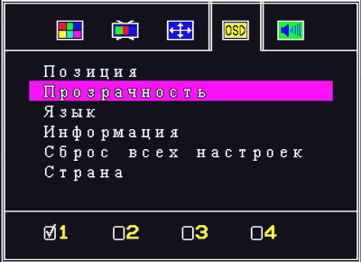 В настройках экранного меню находятся регулировка его положения, прозрачность (4 градации), язык (русский, украинский, английский), информация о версии прошивки (0.9 у нашего экземпляра), сброс всех настроек и выбор страны. Список доступных регионов своеобразен — Россия, Гонконг, Китай, Тайвань, Украина. Отсутствие настройки времени нахождения меню на экране компенсируется относительно комфортной задержкой по умолчанию.