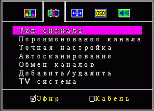 Следующим пунктом идёт раздел настройки и сортировки каналов. Тип сигнала позволяет выбрать антенный или кабельный диапазон, но в отличие от V300, поиск по объединённому списку отсутствует. Хотелось бы верить, что эта возможность будет добавлена в следующих версиях прошивки.