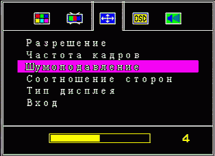 Настройки дисплея позволяют установить разрешение (полный список приведён выше) и частоту кадров (60 и 75 Гц для всех режимов). Уровень достаточно эффективного аппаратного шумопонижения, как и параметры изображения, применяется ко всем каналам одновременно.