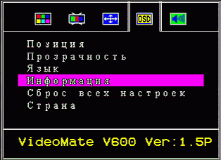 Раздел OSD позволяет настроить положение экранного меню, прозрачность (4 градации), язык (русский, украинский, английский) и предоставляет информацию о версии прошивки ( 1.5P у нашего экземпляра). Здесь находятся сброс всех настроек и выбор региона — России, США/Канады (при выборе тюнер переводится в NTSC с исчезновением пункта, отвечающего за выбор стандарта цветности) и Украины. Время отображения меню на экране не настраивается, что компенсируется относительно комфортной задержкой по-умолчанию.