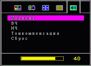 Раздел аудиопараметров содержит настройки уровня громкости, тембра высоких и низких частот, включение/выключение тонкомпенсации (корректный перевод этого режима стоит отметить отдельно) и возврат к звуковым настройкам по умолчанию.