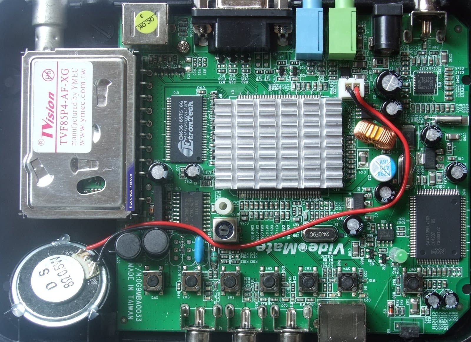 ВЧ-блок классической компоновки TVF85P4-AF-XG компании Young Mountain Electronics Co., Ltd., больше известной нашим читателям по бренду Shenzhen Tenas Electronic Co., Ltd, работающий в паре с VIF-PLL демодулятором TDA9801T производства NXP (бывшее полупроводникового подразделения Philips Electronics, в феврале 2010 года приобретено Trident Microsystems, Inc.) остался прежним.