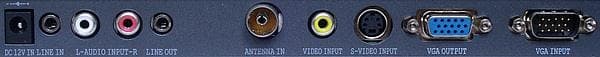 На задней панели расположен полный комплект разъемов: разъем питания (12V), аудиовход (mini-jack), линейный звуковой вход (2 RCA), аудиовыход (mini-jack), антенный вход, композитный и S-Video входы, VGA-разъемы.