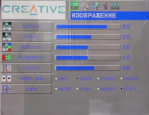 В настройках изображения традиционно находится выбор режимов работы системы шумоподавления. 4 режима (включая полное отключение) позволяют найти приемлемый баланс между чёткостью и наличием помех. К том уже, в большинстве случаев достаточно режима WEAK (СЛАБОЕ). Кроме ручной настройки параметров изображения (контраст, яркость, цветность, насыщенность и резкость), предусмотрено три предустановленных режима.