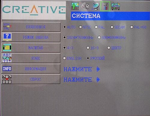 Кроме изменения соотношения сторон (4:3 и 16:9), доступно центрирование изображения. Здесь же можно изменить язык меню (поддерживаются английский и русский варианты интерфейса).