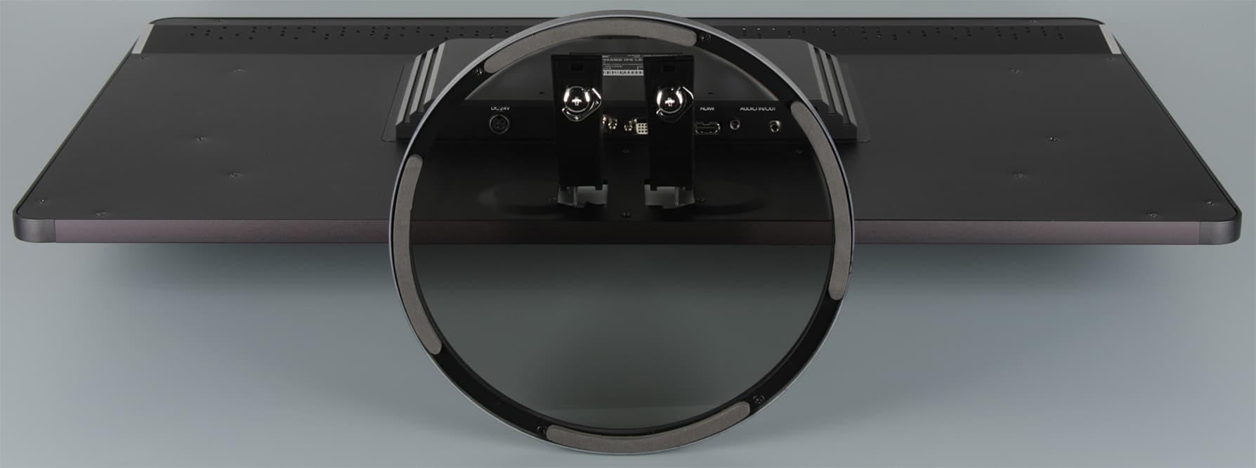 Заглушки оснащены светодиодной подсветкой, дублирующей цвет индикатора состояния на фронтальной панели. Фигурный выступ на задней панели — из пластика с черной матовой поверхностью. Разъем питания и интерфейсные разъемы расположены на нижнем торце этого выступа и ориентированы вниз. При обычной ориентации монитора разглядеть подписи к разъемам практически невозможно (но, впрочем, не особенно и нужно, так как подсказка нужна только к двум одинаковым разъемам миниджек). Штатная подставка представляет собой весьма оригинальную конструкцию. Основание изготовлено из слегка тонированного (видимо, в массе, а не пленкой) минерального стекла. Периметр основания свободно охватывает пластиковый ободок, к которому снизу прикручено стальное кольцо с накладками из пористого пластика на нижней плоскости.