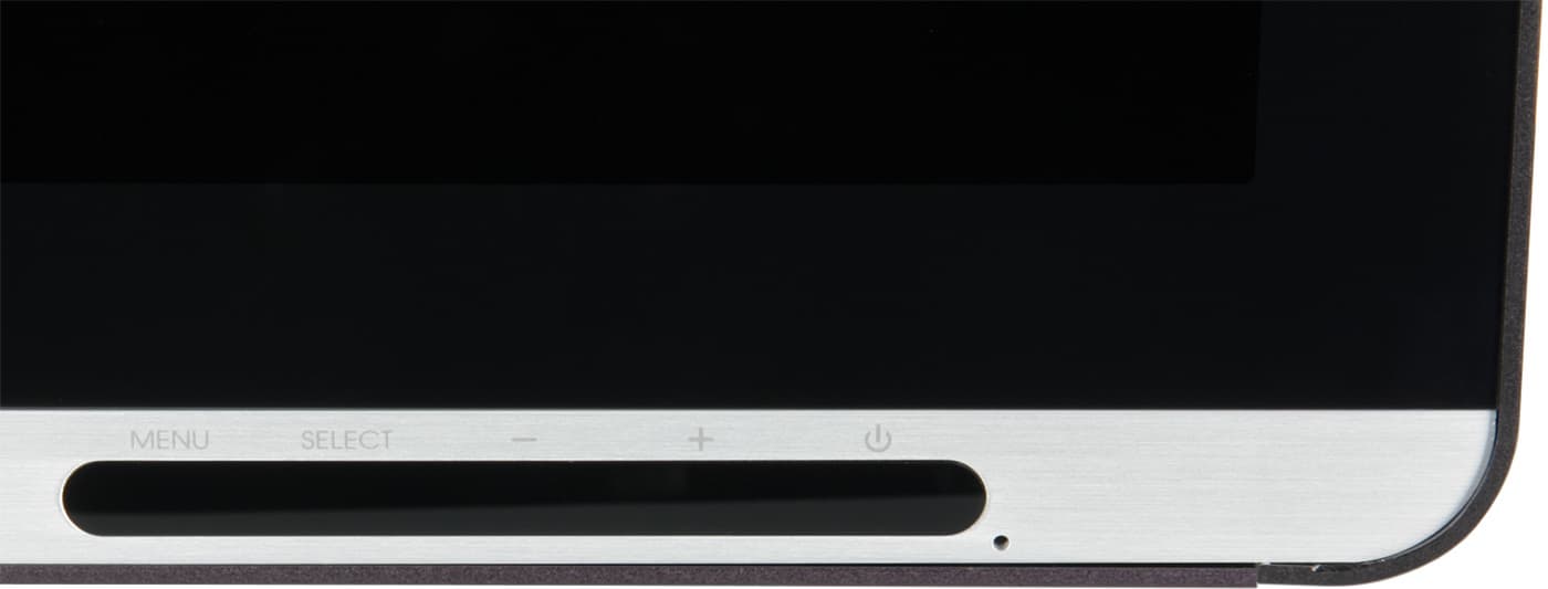 Дизайн монитора очень строгий и аскетичный. Зеркально-гладкое минеральное стекло закрывает бо́льшую часть фронтальной панели, и только нижний край отчерчен узкой вставкой из алюминия. Поверхность самой матрицы черная. Двоение отраженных объектов в экране очень слабое, это свидетельствует о том, что между слоями экрана (конкретнее — между внешним стеклом и поверхностью ЖК-матрицы), скорее всего, нет воздушного промежутка (экран типа OGS — One Glass Solution). Внешнее стекло имеет очень эффективное антибликовое покрытие, поэтому зеркально-гладкая поверхность практически не бликует, и только очень яркие точечные источники света дают в экране хорошо видимое отражение. Отступ от края до собственно границы области отображения относительно большой, но это заметно только тогда, когда на монитор выводится изображение. В правой части алюминиевой вставки за вытянутым овальным окошечком расположены сенсорные кнопки управления, обозначенные едва заметными значками.