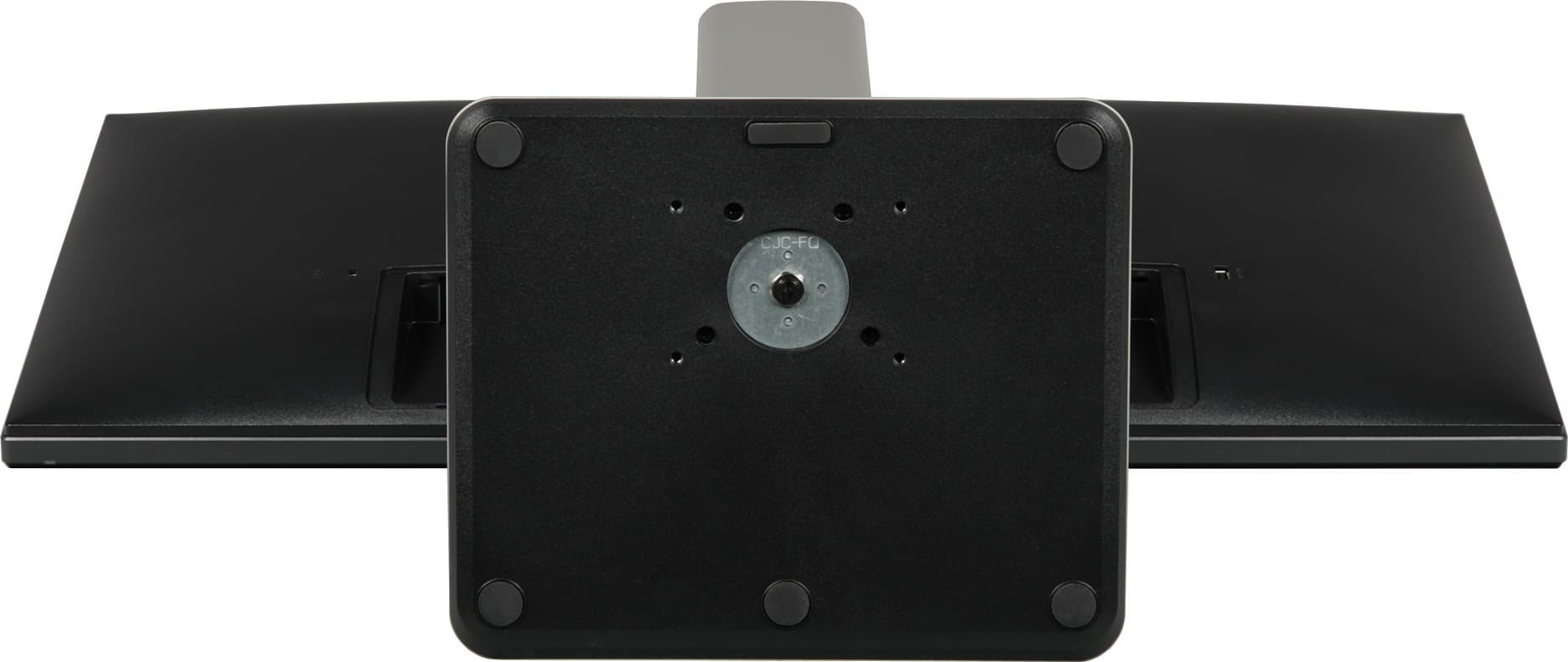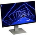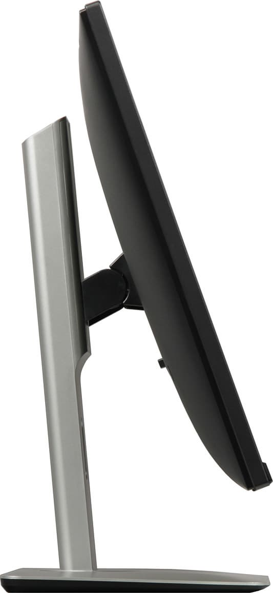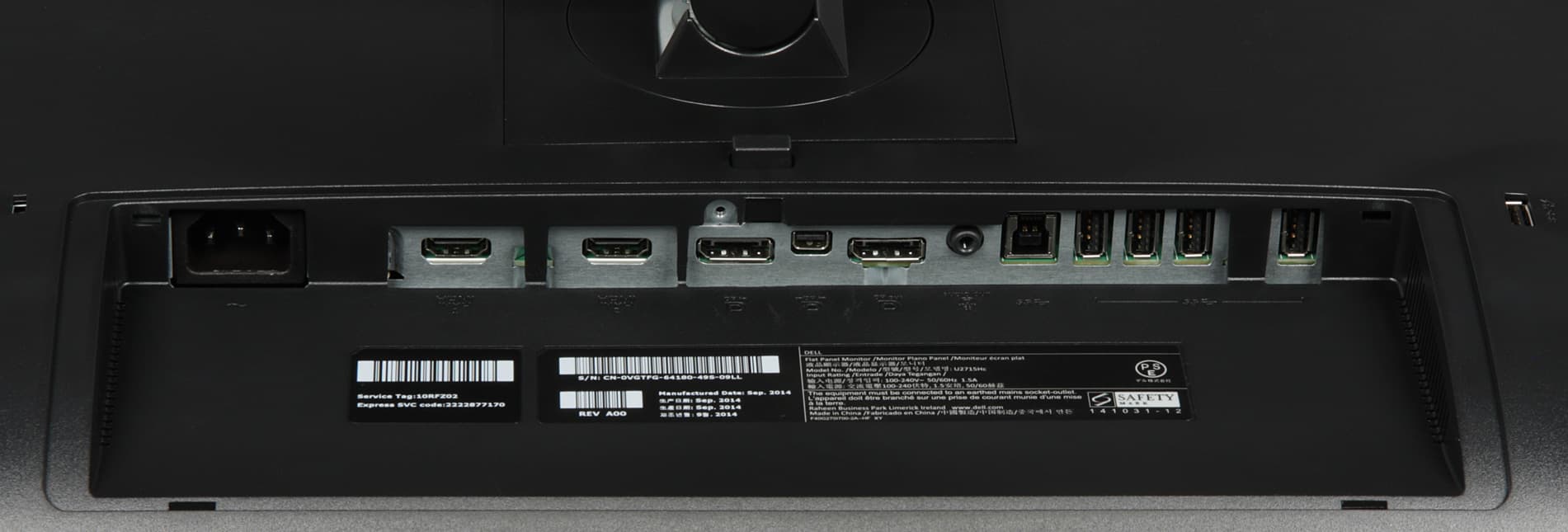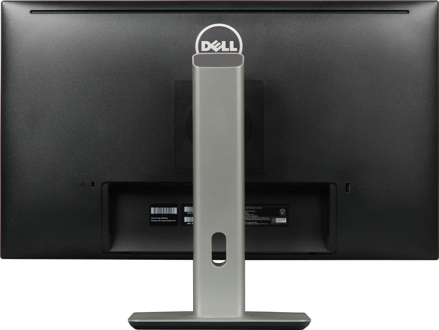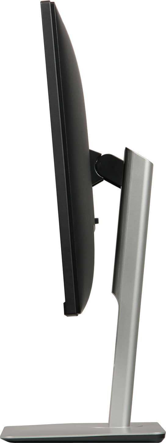 Вверху на задней панели — узкая вентиляционная решетка. Разъем питания и почти все интерфейсные разъемы расположены в нише на задней панели и ориентированы вниз. К монитору прилагается кабельная крышка, зарывающая эту нишу (на не досталась). Слева (если смотреть сзади) от этой ниши можно обнаружить разъем для кенсингтонского замка, справа один из пяти выходных разъемов USB и единственный с повышенной нагрузочной способностью (на что указывает значок молнии). Монитор оснащен встроенным блоком питания. Внешние панели подставки изготовлены из пластика с матово-черной поверхностью или с серо-серебристым покрытием. Нижняя панель основания — из черного пластика с матовой поверхностью. Штатная подставка позволяет блок экрана немного наклонить вперед, отклонить назад, приподнять, повернуть вправо-влево и перевернуть в портретную ориентацию как по, так и против часовой стрелки.