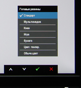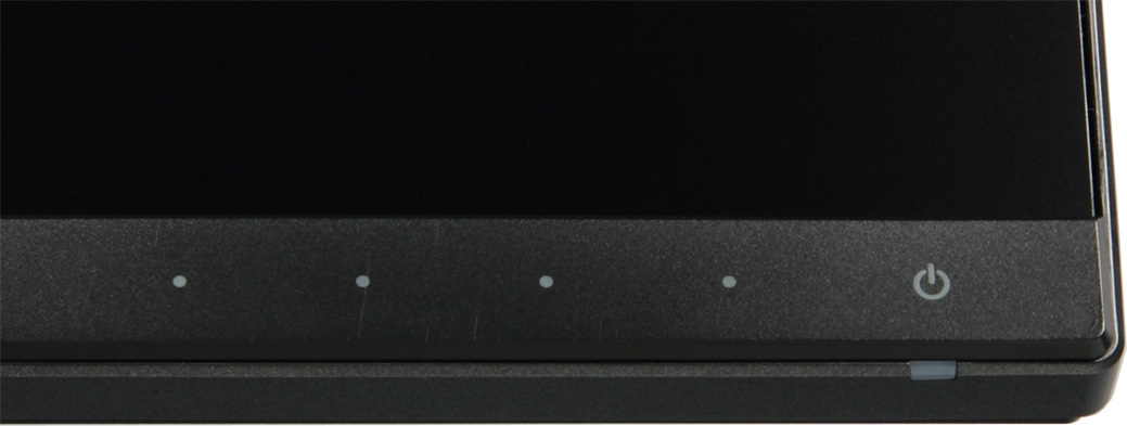 Индикатор питания при работе неярко светится белым (отключается в меню), в режиме ожидания — мигает белым и не горит, если монитор условно выключен. Когда на экране нет меню, то при первом прикосновении к кнопкам-точечкам на экран выводится стартовое меню в виде четырех значков точно над кнопками.