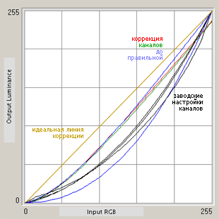 Жестокая правда калибратора Pantone Spyder2pro studio — заводская калибровка по цветам у EIZO не удалась. Проблема в яркости полутонов практически по всей гамме. Хотя между собой каналы настроены довольно гармонично и завалов почти не наблюдается (синий канал для ярких полутонов слегка придушен). Но если посмотреть на график Samsung 193P+ на схожей матрице, то картина будет аналогичная, хотя в нюансах корейский монитор менее сбалансирован между каналами.