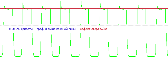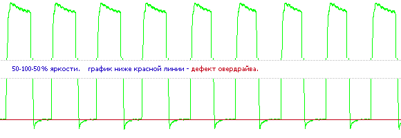 Что это? Попытка избежать артефактов овердрайва? Если посмотреть внизу, то видно, что EIZO не смогли все же сделать это совсем чисто. Возможно, абсолютно корректный овердрайв и невозможен? Заодно воочию наблюдается и «овердрайв наоборот».