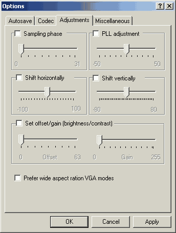 Программа позволяет осуществлять автоматический захват отдельных кадров и запись видеопотока. В разделе Autosave опций программы можно настроить интервалы захвата, как покадрово, так и по времени, выбрать формат (BMP, PNG, JPEG (компрессия составляет 85%), AVI) и установить префиксы названий получаемых файлов. При этом допускается как десятичная система (переменная d в наименовании), так и шестнадцатеричная (переменная X). Возможно преобразование полученных в формате BMP изображений в AVI, выполняемое программой после окончания захвата. Кроме того, реализована функция паузы.