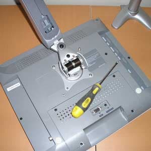 | Шаг 4. Запомнив положение площадки, берем панель и, используя приложенные винты, крепим ее к кронштейну через готовые отверстия (VESA). Обратите внимание — на фотографии показано правильное положение кронштейна и панели. Если закрепить панель иначе, то вы получите изображение вверх ногами и не сможете его развернуть (у площадки степень свободы рассчитана на поворот лишь на 90 градусов). | ![]() |