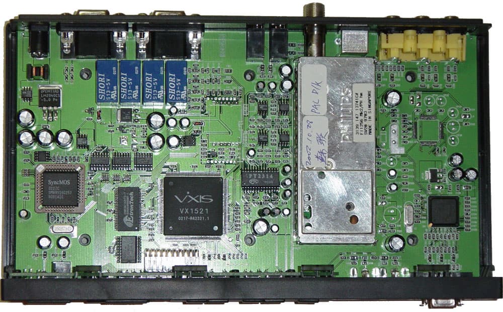 Как видим вся конструкция состоит из РЧ-модуля тюнера и нескольких чипов. Начнем по порядку. Управляет устройством микроконтроллер SyncMOS SM89516. Затем в глаза бросается самый большой чип — VX 1521. Это специализированный процессор, предназначенный для преобразования принятой в телевидении черезстрочной развертки в прогрессивную, на которую ориентировано подавляющее большинство компьютерных CRT и LCD-мониторов. А также дополнительно на него возложена реализация экранных меню (OSD). Судя по документации, опционально этот чип можно дополнить SDRAM-памятью для реализации Motion-Adaptive 3D Deintelace. Именно этот случай мы и наблюдаем в виде двухмегабайтного модуля памяти EtronTech. За декодирование видео отвечает декодер Philips 7118 (справа).