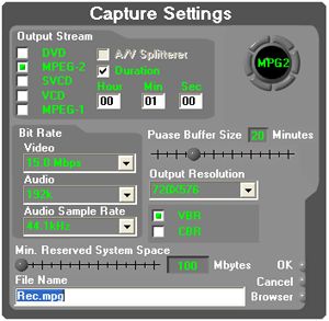 Пришло время исследовать самый главный «конек» этой платы — возможность записи в MPEG-файлы. Вот здесь плата оказалась на высоте. Вернее, это даже заслуга не платы и ее изготовителей, а самого чипа iTVC 15. Настройки лаконичны, но достаточны для большинства типовых применений: