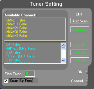 Нижнее окно показывает доступные частотные каналы. Их можно включить кнопкой «Add CH», тогда значение «False» изменится на «ОК». Или обратно выключить кнопкой «Del CH». Кнопка «Edit Ch» позволяет только изменить текстовое название канала. Далее запускаем автосканирование и его результаты наблюдаем в верхнем окне. Поясню, что термин «false» в данном контексте означает, что на данном канале сигнал не обнаружен. Просканировав весь диапазон, тюнер так ничего и не нашел. При отрицательных результатах автосканирования верхнее окно в результате при выходе очищается. Ключ «Scan By Freq» и значение «Fine Tune» ни на что не влияют.