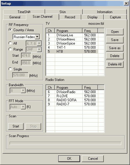 Допускается изменение большинства параметров, влияющих на поиск каналов. При этом телеканалы и радиостанции отображаются отдельно. Все доступные каналы были обнаружены при выборе России в качестве региона.