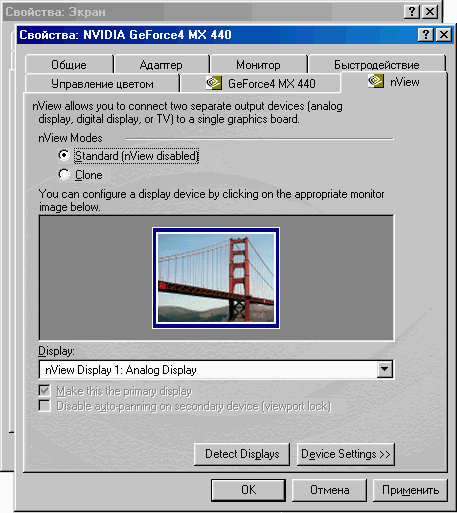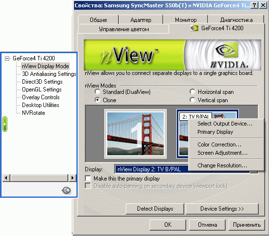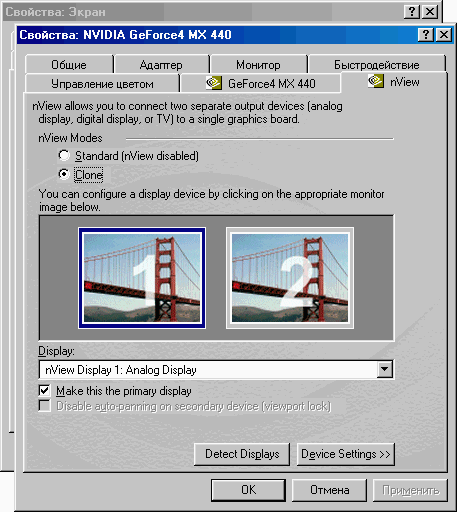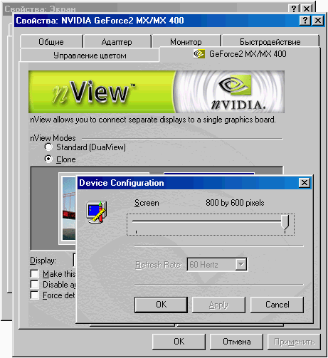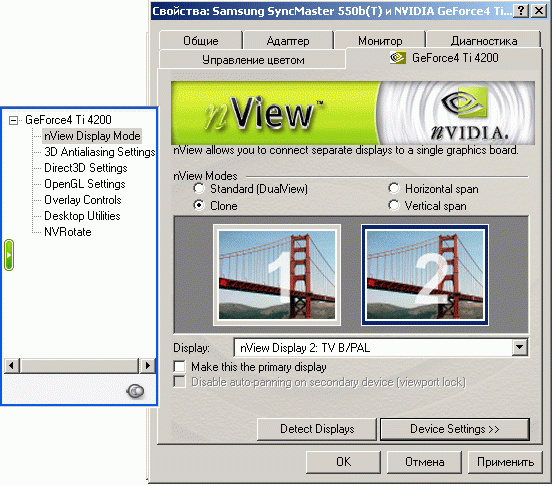 Для просмотра разных изображений на мониторе и телевизоре благодаря технологии TwinView (nView) у видеокарт GeForce2MX/4MX/4ti можно с успехом использовать режим Clone, главное при этом — правильно настроить драйвер.