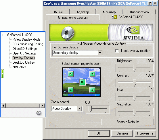 Примечание: TVTool, при всех своих достоинствах, не поддерживает мультимониторность. Это не было критично при работе с картами на базеGF2 и GF3, но для желающих полноценно использовать TwinView (nView) на картах GF4 рекомендовать ее, пожалуй, не будем. Для них — следующий раздел :