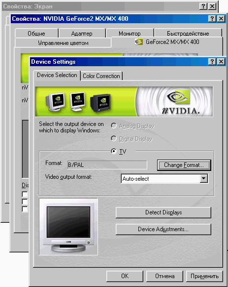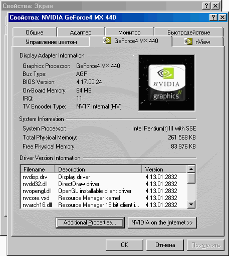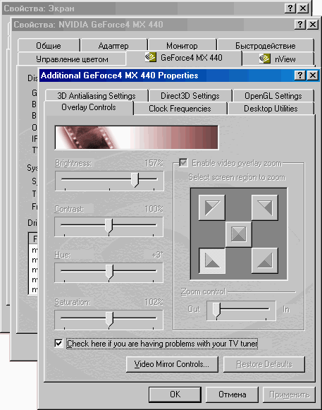 Совершенно очевидно, что для видеокарт GeForce4MX и GeForce4ti использовать драйвера Detonator более старых серий, чем 27.хх, нельзя — они просто еще «не знают» о существовании таких видеокарт. Но и здесь принцип «чем новее — тем лучше» не срабатывает: видеокарты GeForce4MX с некоторыми версиями VideoBIOS в сочетании с рядом драйверов Detonator из серий 28.хх и 29.хх «не видят» наличия TV-Out и, соответственно, не могут вывести изображение на телевизор. Причем с другой версией VideoBIOS проблем может и не быть, и TV-Out будет нормально функционировать. Исправленный BIOS для МХ440 с внутренним TV-encoder можно взять здесь. У авторов также имеются сведения, что такая проблема может возникать с рядом Detonator серий 28.хх и 29.хх не только у GeForce4MX, но и у GeForce2MX и GeForce4ti с определенными VideoBIOS. Так что если у Вашей видеокарты после установки очередного драйвера Detonator (с которым на соседском компьютере телевизор прекрасно работает) вдруг перестал определяться TV-Out, не спешите бежать в гарантийный отдел фирмы-продавца, а попробуйте для начала установить другой Detonator. Для контроля можно попробовать вернуть тот, что работал до неудачной перестановки драйвера, и в случае успеха или искать новый Detonator с работающим TV-Out или прошивать другой VideoBIOS (более новый или более старый). То же самое можно порекомендовать, если видеокарта Вашего компьютера «видит» TV-Out, но доступны не все настройки TwinView (nView). Авторы, к сожалению, не располагают полной базой «совместимых» версий VideoBIOS и драйверов Detonator, так что здесь Вам, уважаемые читатели, придется вести самостоятельные исследования.