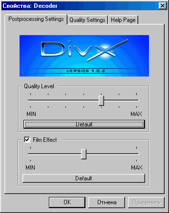 В случае, если Вы не собираетесь заниматься кодированием фильмов в формате DivX, возможно вместо видеофильтра кодека DivX™Video 5.0.2 использовать более простой и весьма неплохо работающий видеофильтр декодера FFDShow, который при небольшом размере дистрибутива (в несколько раз меньшем, чем у DivX™ Video 5.0.2) является полнофункциональным декодером DivX всех форматов (и 3.хх, и 4.хх, и 5.хх), обеспечивая при воспроизведении загрузку процессора меньшую, чем у конкурентов, имеет большое число дополнительных функций улучшения изображения.