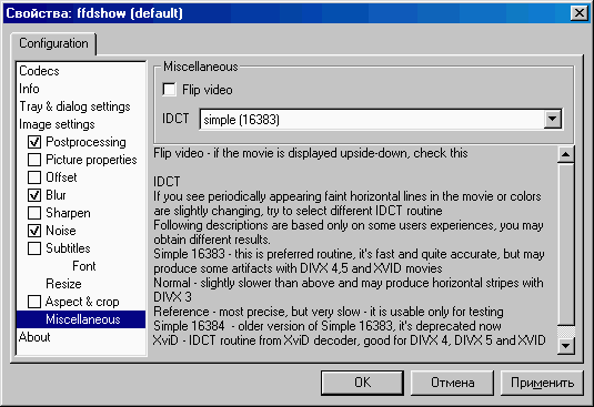 Функция переворачивания картинки »Flip video», аналогичная по действию такой же функции в DivXG400. Меняя IDCT, можно попытаться улучшить качество или уменьшить нагрузку на процессор за счет разных способов декодирования.