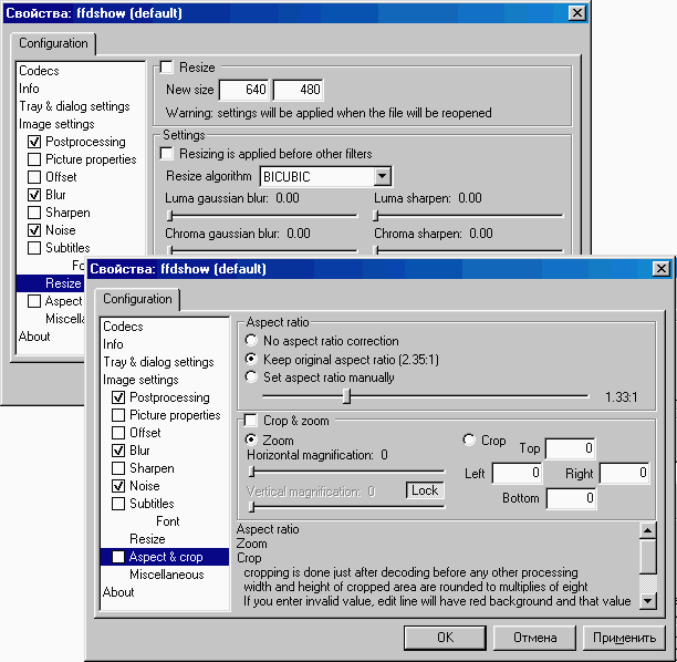 FFDShow — быстро прогрессирующий декодер. От версии к версии появляются все новые возможности по обработке изображения, поддержка новых стандартов. Помимо поддержки DivX (Mpeg-4) всех видов появилась (пока, правда, еще слабая, но «лиха беда-начало») поддержка VideoCD (Mpeg-1) и даже DVD (Mpeg-2). Растет и число дополнительных способов обработки изображения для повышения качества и удобства. Помимо традиционных видов постпроцессорной обработки, регулировки яркости, контрастности и гамма-коррекции, добавления белого шума для маскирования артефактов. появились широкие возможности по обрезанию, масштабированию и сжатию изображения, множество других полезных настроек.