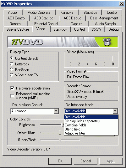 Во-первых, NVDVD, доросший к настоящему моменту уже до версии 1.71 :-), предоставляет выбор из большого количества режимов деинтерлейсинга — извечной проблемы NVIDIA.