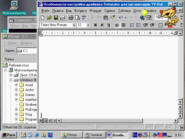 Дальнейшее рассмотрение производится на примерах более старых Detonator 21.85 с видеокартой GeForce2MX с TV-Out ChronTel7008, Detonator 28.32 с видеокартой GeForce4MX с внутренним TV-Out и новых Detonator 40.52 с видеокартой GeForce2MX с TV-Out ChronTel7008 под Windows98SE, а также Detonator 40.41 с видеокартой GeForce4ti4200 с ViVo Philips7108 под WindowsXP.
