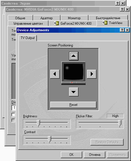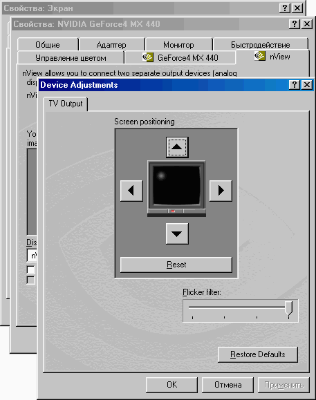 Следующий раздел называется »Настройка экрана». Отсюда можно откорректировать положение изображения на экране телевизора, основную яркость и контрастность, а также задействовать »Фильтр мерцания». Действие «фильтра мерцания» различно для разных видеокарт (а, возможно, и их VideoBIOS) и версий драйвера Detonator. В ряде случаев лучший результат получается в положении »Высокий», в других — »Низкий» или »Выключено». Что лучше конкретно для Вашей видеокарты — можно легко проверить, к счастью, это сделать несложно. По-видимому, чтобы не вносить путаницы, в ряде новых Detonator NVIDIA отказалась от наименования значений «Фильтра мерцания», оставив лишь безымянную линейку. Легко заметить, что в зависимости от модели видеокарты (ее VideoBIOS) и версии Detonator иногда исчезает доступ к настройке »Яркость» и »Контрастность». А ведь это единственная такая настройка, которая распространяется на режим Overlay (см.ниже).