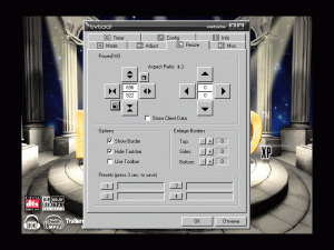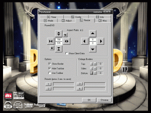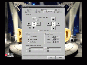 … и находит там из необходимых параметров разве что выбор системы цветности (припоминается кроме этого разве что Detonator 12.41 с возможностью выбора источника S-Video/Composite) :-). Настройки Overscan, помогающие в борьбе с бордюрами на TV, отсутствуют как класс. И начинают плодиться в конференции темы об «отстойном ТВ-ауте на ЖиФорсах» :-). Доходит до курьезов, например, автор этих строк, получив в нагрузку к GeForce3 VIVO неубираемые бордюры, избавлялся от них настройками сервисного меню телевизора (спасибо инженерам Thomson).