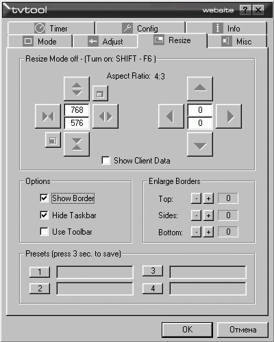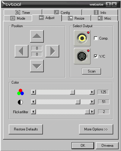 К счастью, есть средство, избавляющее от головной боли в области настроек TV-out. На сайте на данный момент доступна для скачивания Beta 6.0b программы TVTool. Программа является платной, однако это к теме нашего разговора, опять-таки, не имеет отношения, могу посоветовать разве что регулярно посещать конференцию :-).