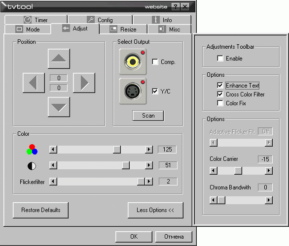 открывает дополнительное меню, позволяющее настроить, в частности, поднесущую цвета «Color Carrier». Это может помочь при несовпадении этой частоты с частотой подключаемых устройств, что выражается, обычно, в черно-белом изображении на TV (естественно, при соблюдении всех описанных выше требований к подключению) или черно-белой записи на видеомагнитофон. Например, у автора цвет на видеомагнитофоне (Samsung SVR-600), появляется только при значении этого параметра «-15», хотя с предыдущими видеокартами изменение стандартных настроек не требовалось.