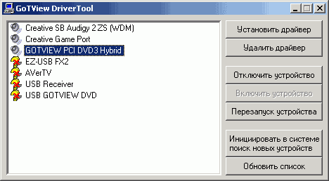 При установке программы GoTView PRO теперь можно отказаться от бесплатного MPEG1/2-декодера от DScaler, в предыдущих версиях устанавливаемого принудительно. Несмотря на то, что меню установочного диска по-прежнему не предусматривает автоматизированной установки и удаления драйвера, наконец-то, появилось решение этой проблемы. На сайте производителя и на CD из комплекта поставки доступна утилита DriverTool, предназначенная для этой цели и не только (любители экспериментов могут попробовать запустить программу с любым ключом вплоть до «/» без дополнительных параметров).