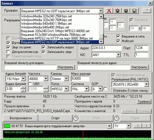 Интерфейс записи с возможностью сохранения и редактирования профилей фактически остался прежним (о выделении параметров режима отложенного просмотра в отдельный раздел меню мы уже говорили), чего нельзя сказать о фирменной технологии вещания в сеть. В последних версиях программы к HTTP добавилась поддержка мультикаст (UDP) и аппаратного сжатия при передаче видеопотока по сети.