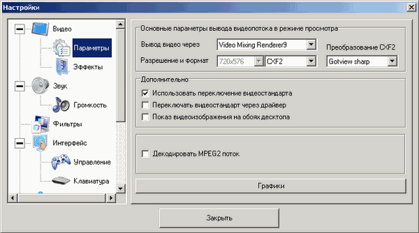 В подразделе Параметры можно найти настройки вывода видеопотока в режиме просмотра — выбор рендерера (поддерживаются VMR7 и VMR9) и выбор варианта цветового преобразования, обусловленный тем, что последние АЦП и аппаратные кодировщики от Conexant работают со своим форматом CXF2.