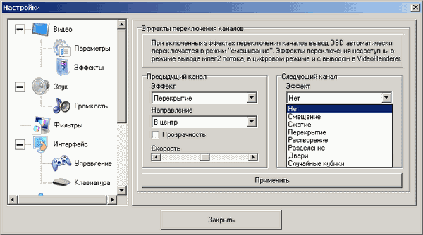 Подраздел Эффекты отвечает за выбор видеоэффектов при переключении каналов.