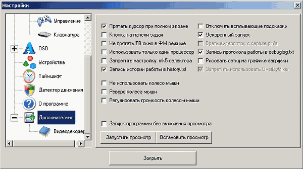 Уникальной возможностью программы является подключение сторонних Direct Show (DS) фильтров и DirectX Media Objects (DMO) как при просмотре, так и при записи, для чего существует соответствующий раздел.