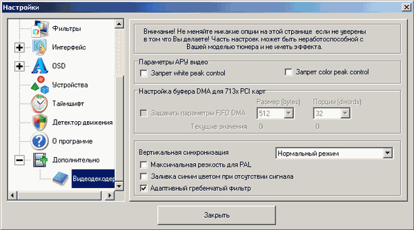 Отключение адаптивного гребенчатого фильтра и возможность задать порог фазы Сomb фильтра CX25843 (чекбокс Максимальная резкость для PAL) работоспособны и для CX23418. Эти настройки доступны в подразделе Видеодекодер.