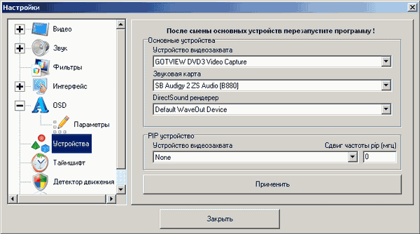 В наследство от лежащей в основе GoTView PRO программы FlyDS досталась поддержка режима «картинка-в-картинке» (Picture-In-Picture, PIP) при наличии второго устройства видеозахвата. Выбор осуществляется в разделе Устройства.