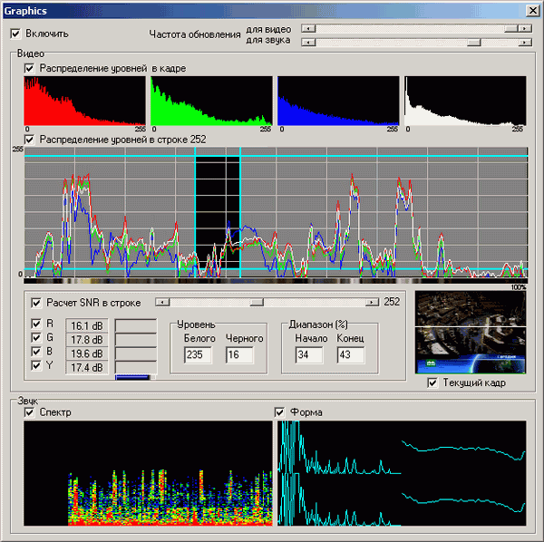 Кнопка Графики вызывает встроенный в программу интерфейс для измерения и отображения таких параметров произвольной видимой строки телевизионного кадра как отношение сигнал/шум (ОСШ), и уровни распределения цветовых компонентов.