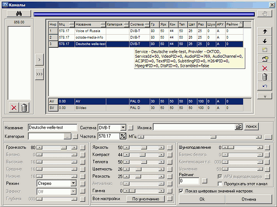Присущие цифровым каналам VPID (Video Program Identification) и APID (Audio Program Identification) доступны только для просмотра, однако редактирование файла cnls.ini позволяет изменять эти параметры. Неудобство такого подхода компенсируется отсутствие необходимости в корректировке этих значений в обычных условиях, к тому же, некоторые производители, вообще, не предоставляют доступ к таким настройкам. Индивидуальная настройка видеопараметров (яркость, контраст, теплота, цветность, резкость, гамма, программное шумоподавление) для цифровых каналов требует вывода изображения с помощью Video Mixing Renderer9. Впрочем, этот режим поддерживают практически все присутствующие на рынке видеокарты.