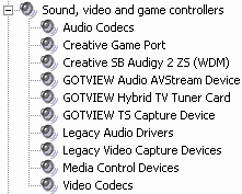 После установки драйвера в разделе Sound, video and game controllers диспетчера устройств можно обнаружить GOTVIEW Audio AVStream Device, GOTVIEW Hybrid TV Tuner Card и GOTVIEW TS Capture Device.