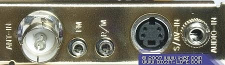 Расположение разъёмов на планке полностью копирует схему, используемую в PCI DVD3 Hybrid. Телевизионная антенна подключается к стандартному разъёму IEC, FM-антенна — к разъёму mini-jack 2.5 мм. Отметим, что расположенные рядом одинаковые разъёмы для подключения ИК-датчика пульта ДУ и FM-антенны требуют определённой внимательности при установке тюнера. Композитный сигнал полноценно снимается с S-Video разъёма, соответствующий переходник входит в комплект.