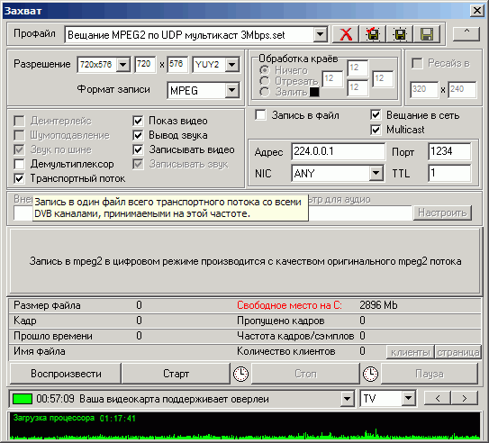 Кодеки, устанавливаемые с этой программой, также обеспечивают программную запись в MPEG2 и функционирование режима отложенного просмотра Timeshift.