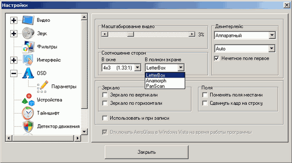 Раздел Видео содержит настройки масштабирования (общие для всех каналов), соотношения сторон (4:3, 14:9, 16:9, 16:10), настройки фильтров деинтерлейса (аппаратный и несколько разновидностей программного, в том числе, с удвоением частоты кадров). В условиях нашего вещания возможность поменять поля местами или сдвинуть кадр на строку может оказаться востребованной.