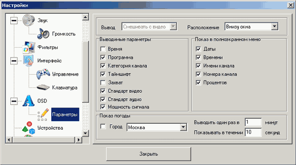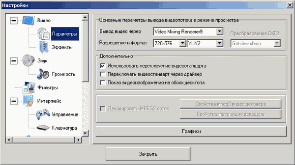 При работе с цифровыми каналами доступны только настройки масштабирования, выбор видеорендерера и параметры выбранного декодера.