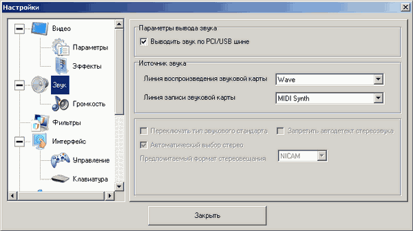 Для управления громкостью отведён отдельный подраздел, в котором, в частности, выбирается интерфейс регулировки громкости (системный микшер или DirectSound).